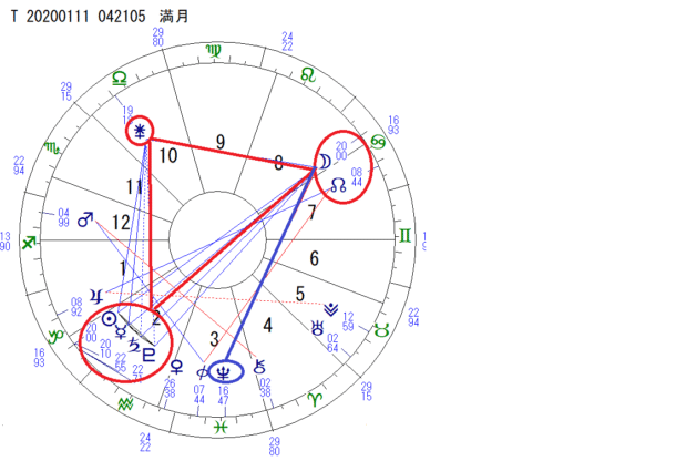 月が蟹座8ハウス、太陽が山羊座2ハウス、そこに水星、土星冥王星がタイトに関わった満月です。
