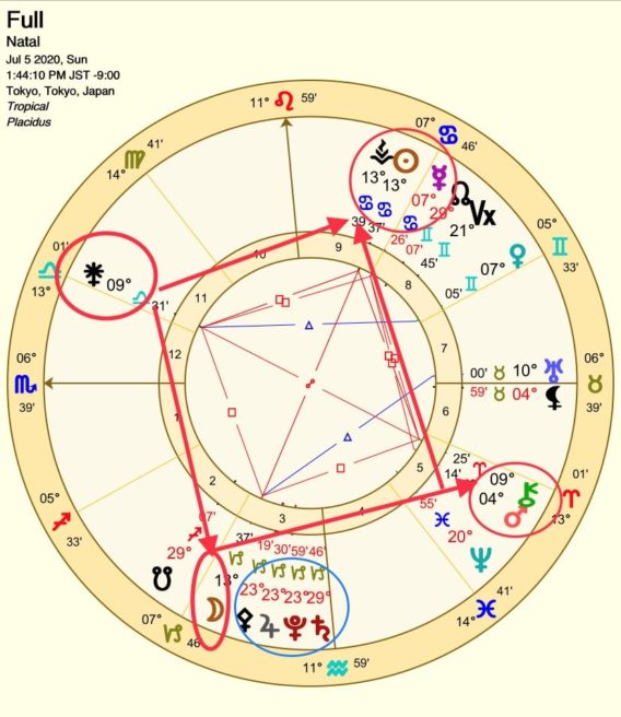 一方、満月を担う蟹座太陽は9ハウスでベスタと13°できっちり重なり、そこには逆行中の水星がいます。