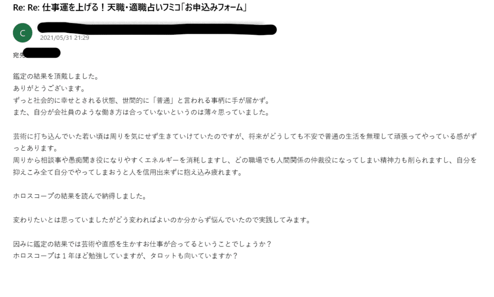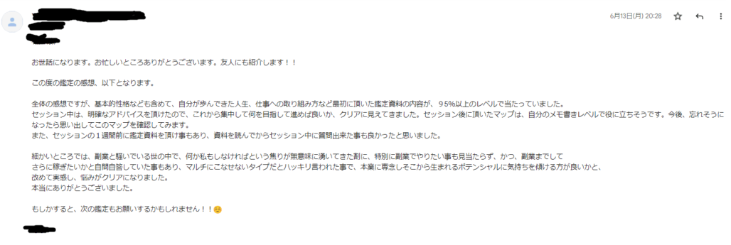- 御鑑定内容は、凄く当たっていて驚きました!人見知りが激しいのですが気の合う人とは打ち解けて話すことは出来ます