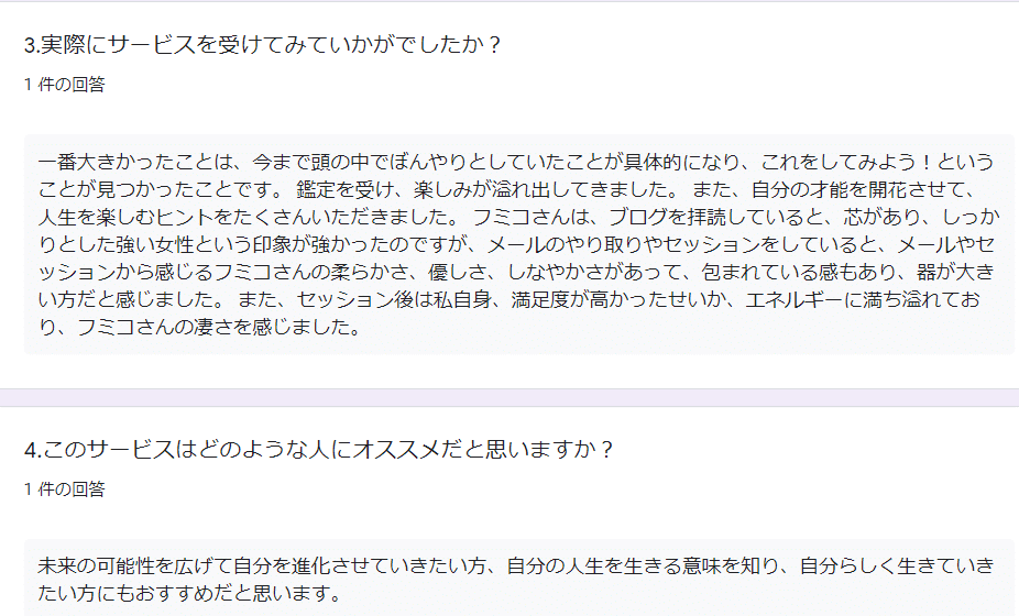- 過去~未来、自分と相手の心境まで丁寧に読み解いてくださったので、フミコさんのカードが全て見抜いているように感じられ自分の内側に気づくことができ、私も今回を機に再スタートできそうです(40代女性H美さん)