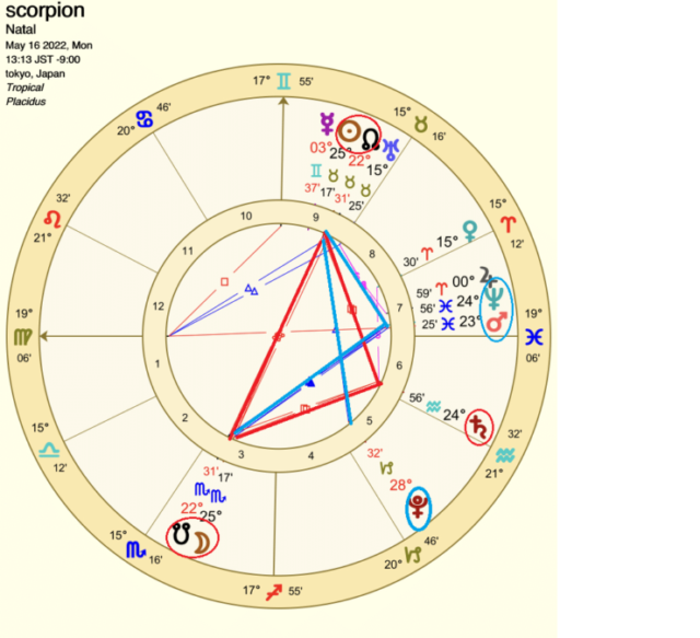 国民を意味する月は3ハウスにいて蠍座25度ですが