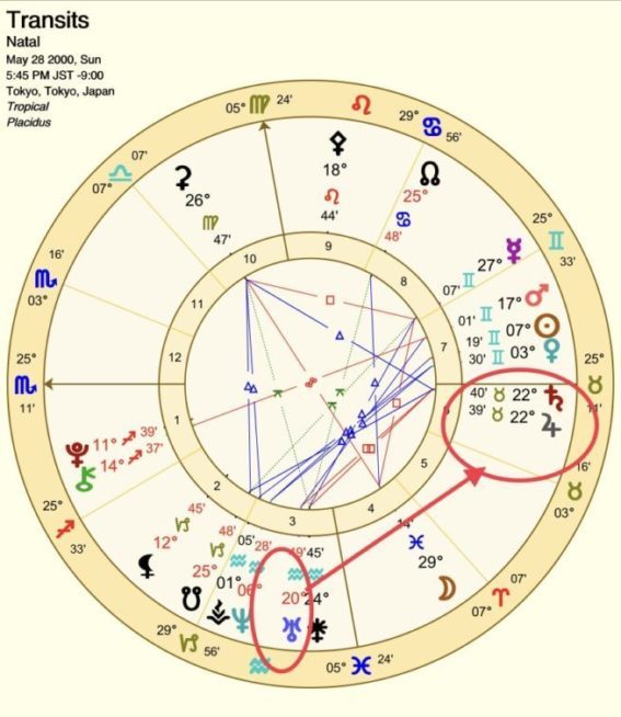 2000年5月28日、牡牛座22°で起きた木星・土星のコンジャンクションと、水瓶座天王星のスクエア時には