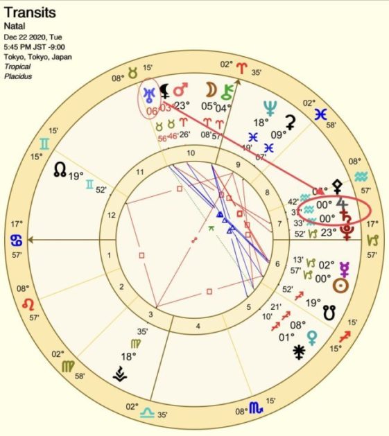 2020年12月22日、水瓶座0°で起こる木星・土星のコンジャンクションと、牡牛座天王星がスクエアを