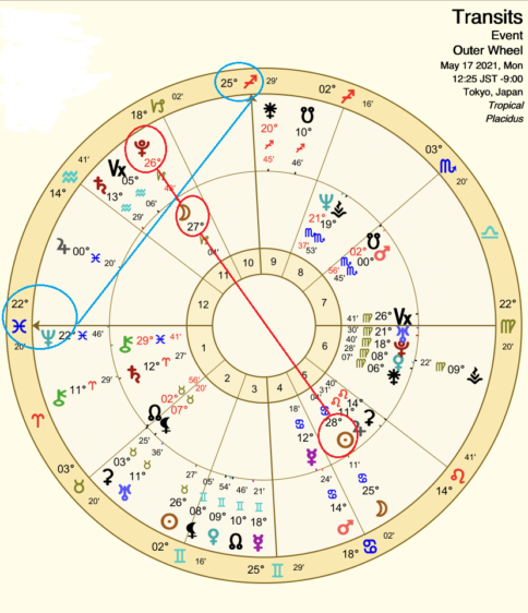 トランジット22°の海王星が、魚座22°のアセンダントにピタリと重なり